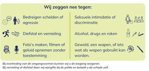 - Het dragen van of dreigen met voorwerpen die als wapen kunnen worden gebruikt, is niet toegestaan en kan leiden tot het ontzeggen van de toegang tot alle SEIN locaties.