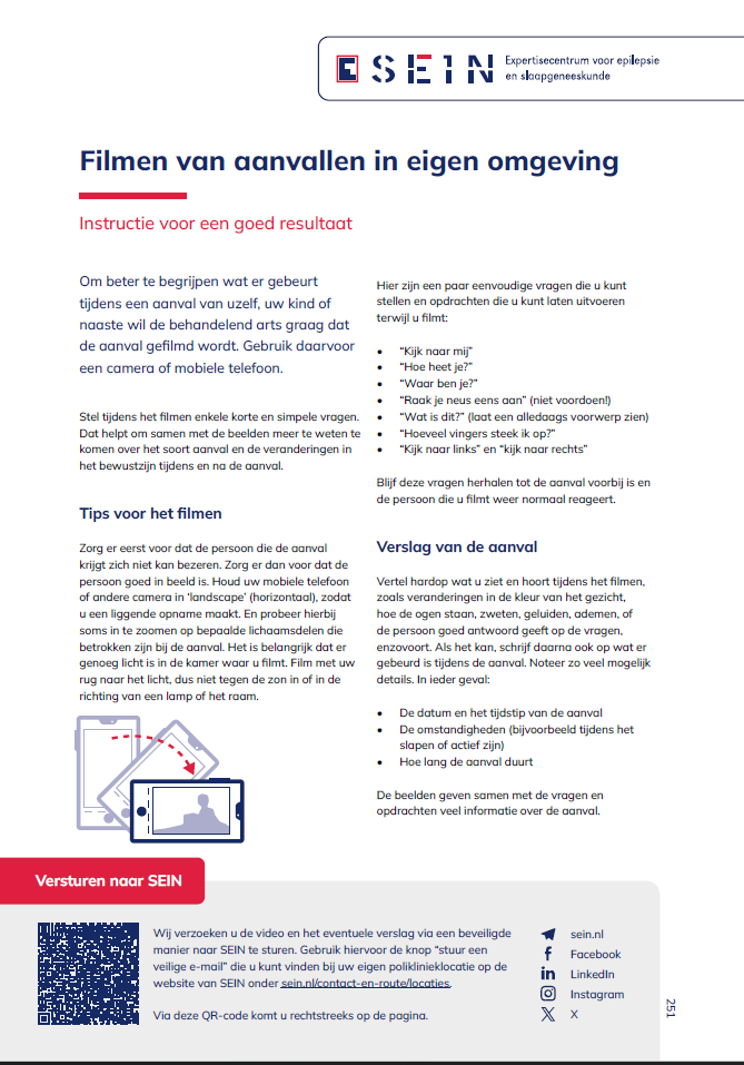 Om beter te begrijpen wat er gebeurt tijdens een aanval wil de behandelend arts graag dat de aanval gefilmd wordt. Gebruik daarvoor een camera of mobiele telefoon. U hoeft uw eigen aanval niet te filmen.