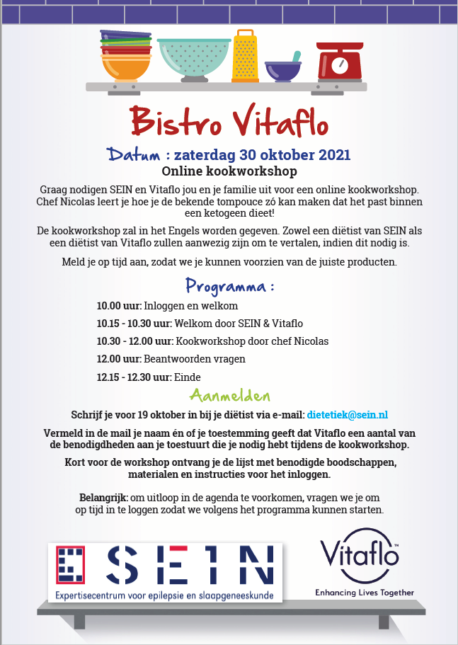 Ter ere van het 100 jarig bestaan van Ketogeen Dieet Therapie organiseert SEIN samen met Vitaflo Chef Nicolas een feestelijke online kookworkshop op zaterdag 30 oktober 2021. Deze kookworkshop is bestemd voor patiënten die Ketogeen Dieet Therapie volgen en hun familie. De kookworkshop wordt in het Engels gegeven met Nederlandse ondersteuning. Het programma en de recepten zullen de komende periode bekend gemaakt worden. Het programma zal ongeveer 3 uur duren. Bent u (familie van) een patiënt bij SEIN voor Ketogeen Dieet Therapie, dan kunt u zich aanmelden bij uw behandelend diëtist voor 19 oktober aanstaande.